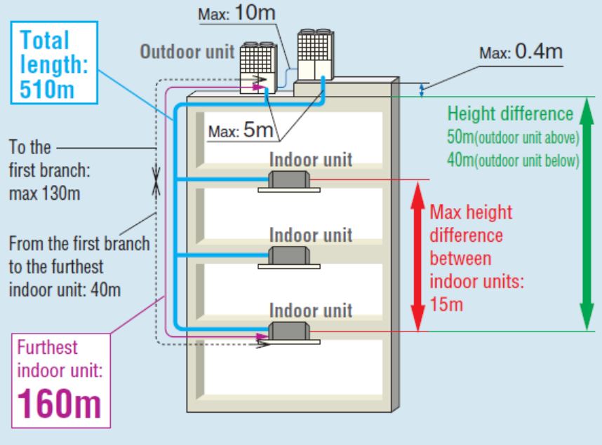 Η διαφορά του συστήματος από τα συστήματα κλιματισμού VRF, είναι ότι το ρευστό μεταφοράς ενέργειας είναι το νερό και όχι το ψυκτικό αέριο.